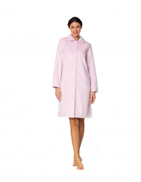 Bata de mujer abotonada con cuello bebé y bolsillos laterales.