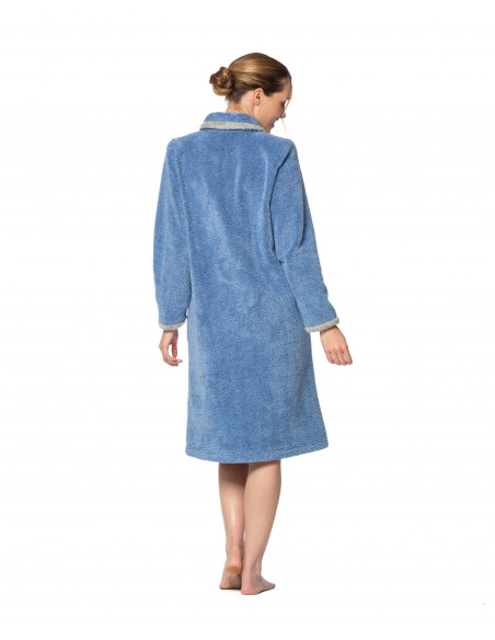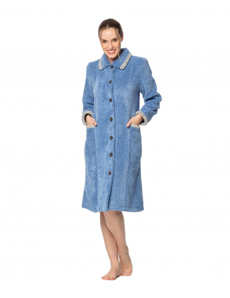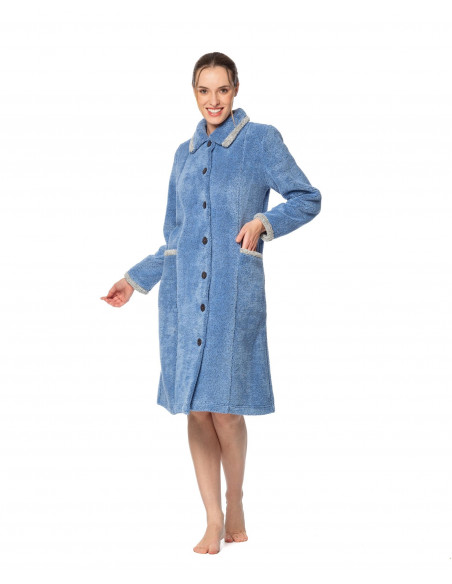 Bata de mujer de rizo abotonada con cuello bebé y bolsillos plastones de estampado bicolor.