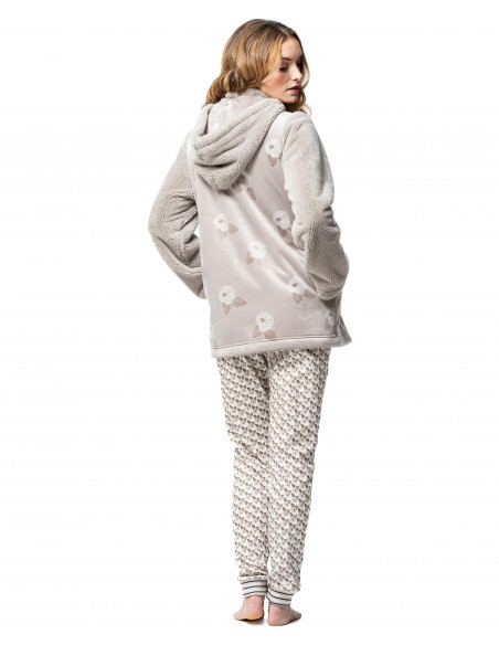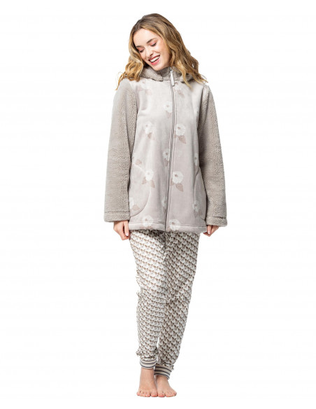 Chaqueta con tejido exterior tipo borreguito y capucha. Ideal para abrigarte en los días más fríos sin perder estilo. Su diseño combina comodidad y calidez con un delicado estampado floral y prácticos bolsillos. Perfecta para completar tu look de estar en casa. Dale a tus momentos de relax el confort que merecen.