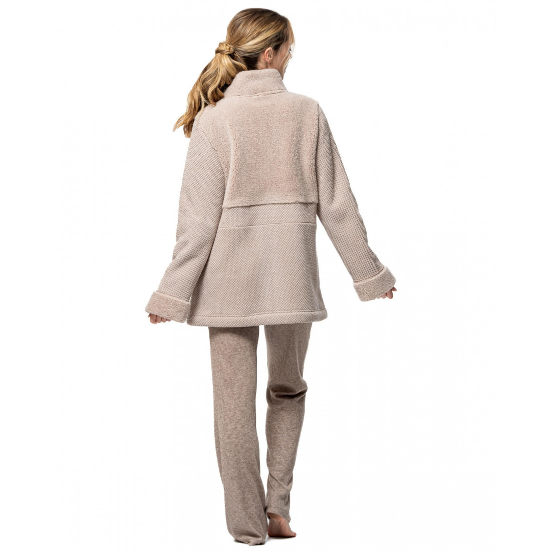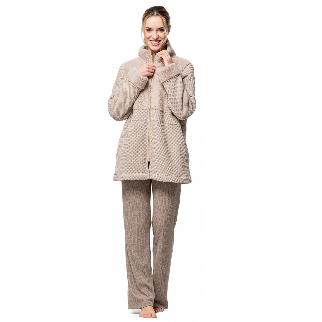 Bata confeccionada en tejido de chenilla con textura waffle, combinada con borreguito en el pecho y el cuello para un extra de calidez. Su diseño con cremallera frontal, bolsillos laterales y cuello alto la convierte en la opción perfecta para estar en casa abrigada sin renunciar al estilo, es ideal para los días fríos en los que buscas confort y suavidad envolvente.