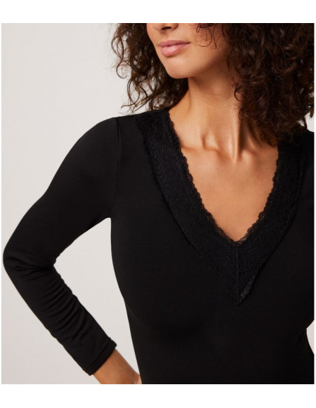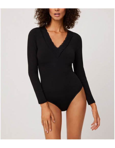 Body Térmico de manga larga con interior afelpado y cuello pico puntilla