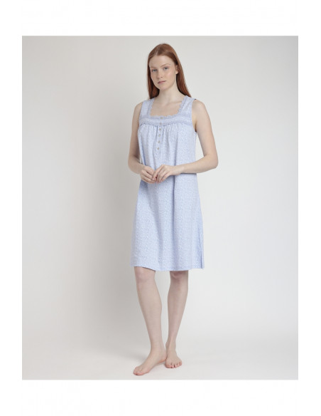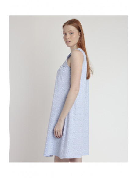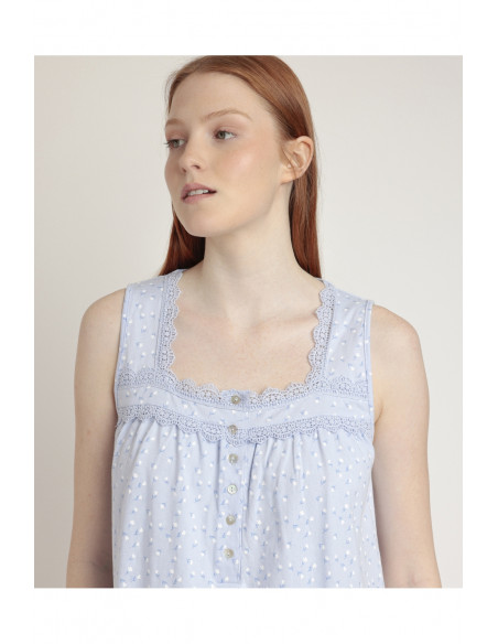 * Camisola de punto viscosa, sin mangas, escote con tapeta con botones y color azul.