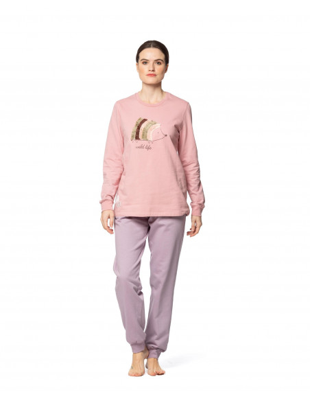 Pijama de mujer felpa de cuello redondo con aplicación de erizo y pantalón de puños.