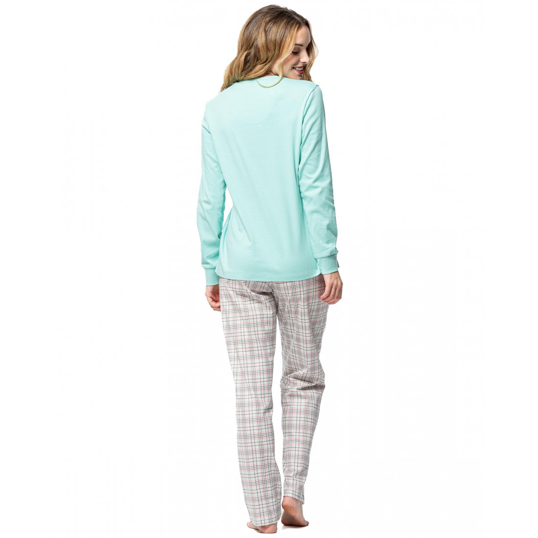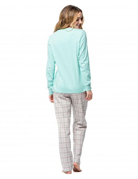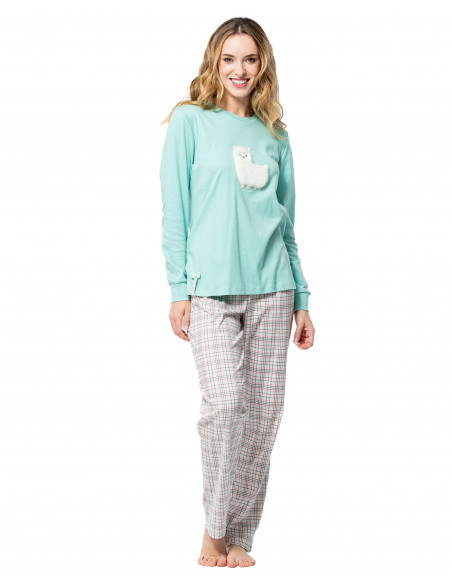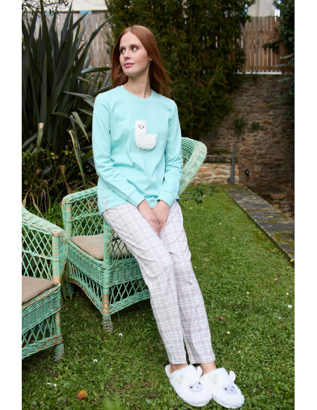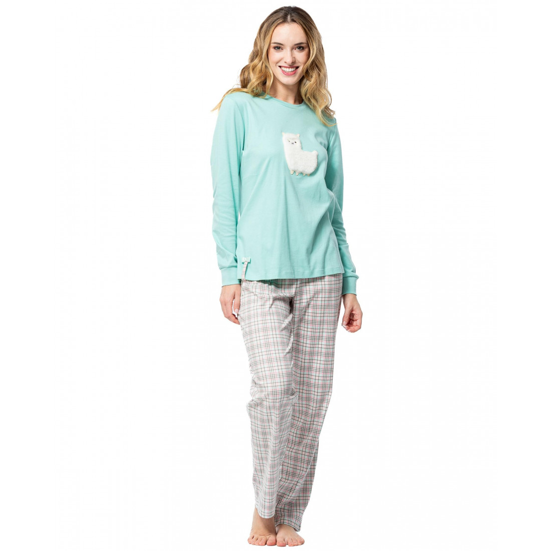 Pijama 100% algodón, ideal para dormir con suavidad y estilo. Camiseta en tono menta con simpático bordado de llama en tejido peluche, y pantalón largo a cuadros de corte recto. Una combinación fresca y divertida que aporta comodidad total para tus noches. Elige confort sin renunciar a los detalles. ¡Hazlo tuyo ahora!