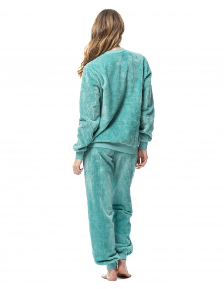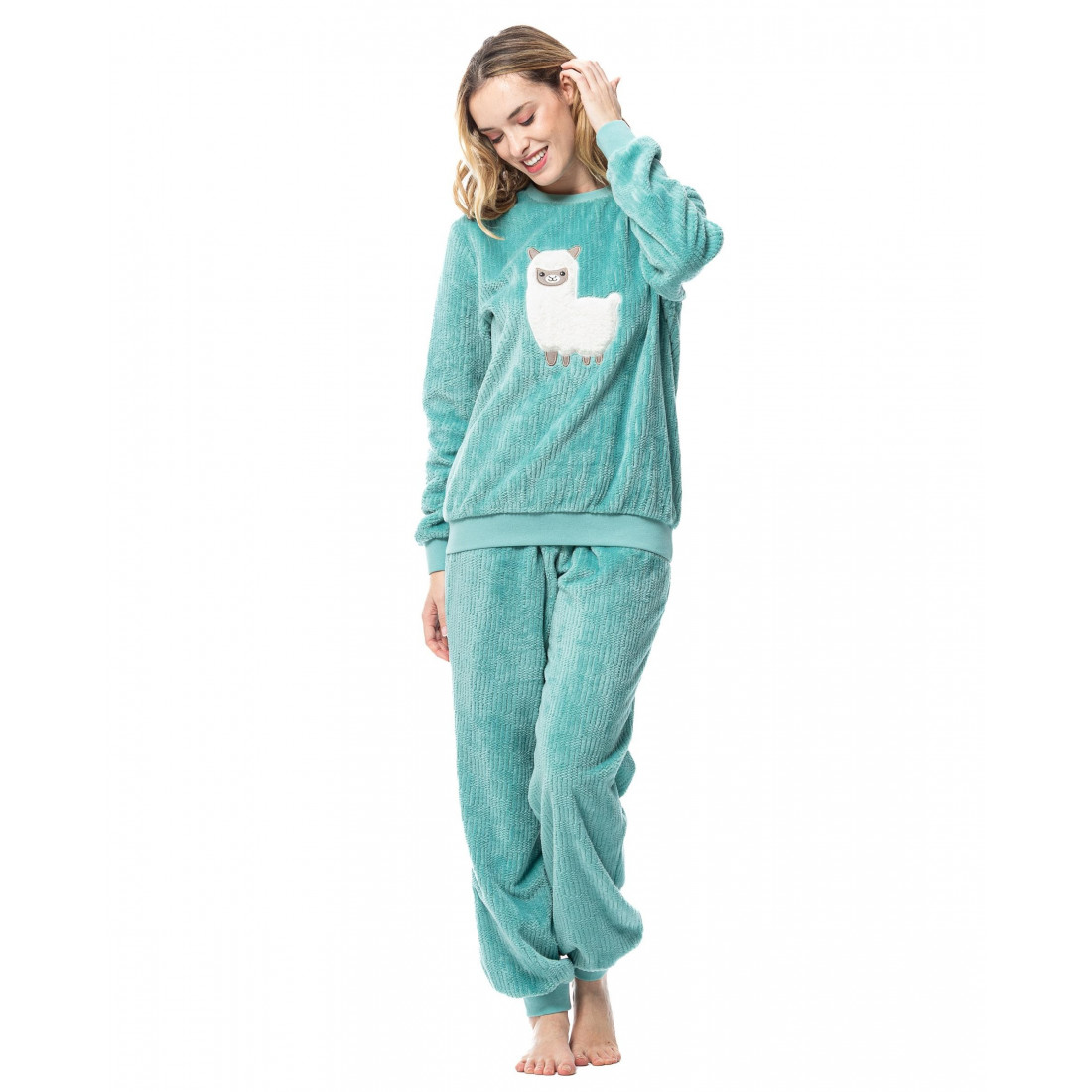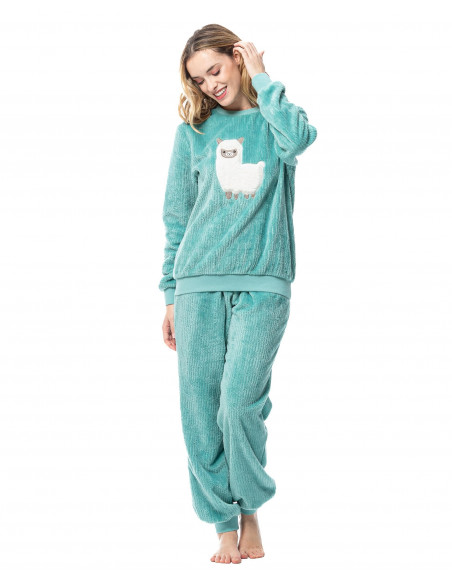 Pijama en tejido de pelito ultrasuave, ideal para mantenerte abrigada con estilo. Camiseta con simpático bordado de llama y pantalón largo con cintura ajustable y puños. Su textura cálida y mullida lo convierte en el compañero perfecto para los días fríos. Confort, ternura y diseño en una sola prenda. ¡Hazlo tuyo ya!