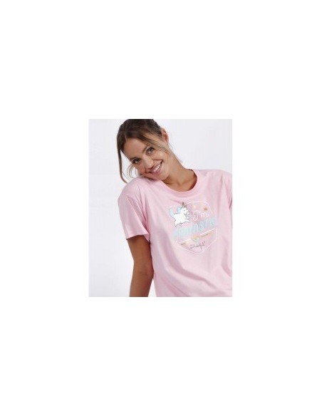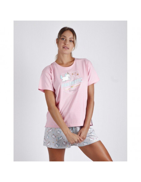 * Pijama de punto de algodón, de manga corta, cuello redondo y pantalón corto.